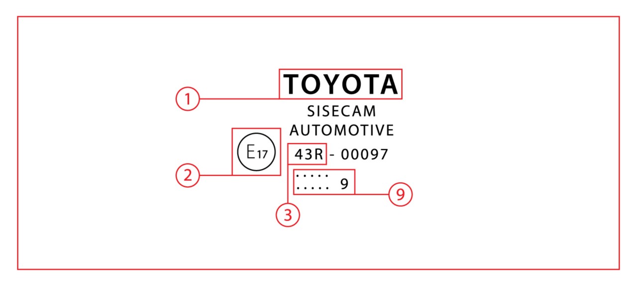 Jednym z najważniejszych oznaczeń na szybie samochodu jest kod homologacyjny, który określa prawo do jazdy pojazdem z danymi parametrami szkła. Norma ta jest dokładnie ujęta w specjalnym Regulaminie nr 43 Europejskiej Komisji Gospodarczej ONZ, który ujednolica przepisy dotyczące homologacji oszklenia. Oznaczenie to jest dobrze widoczne i składa się z wielkiej litery „E” i numeru objętych w kółko. Numer przyporządkowany literze „E” jest zgodny z państwem, w którym szyba uzyskała homologację. Każde państwo posiada własny numer i tak na przykład E1 to Niemcy, E2 – Francja, E3 – Włochy, E4 – Holandia i tak dalej. Jeśli szyba uzyskała homologację w Polsce, oznaczona jest jako E20. Dodatkowym znakiem homologacyjnym jest zapis rozpoczynający się od skrótu „43R”, po którym widać ciąg cyfr będących numerem powyższego regulaminu EKG ONZ.