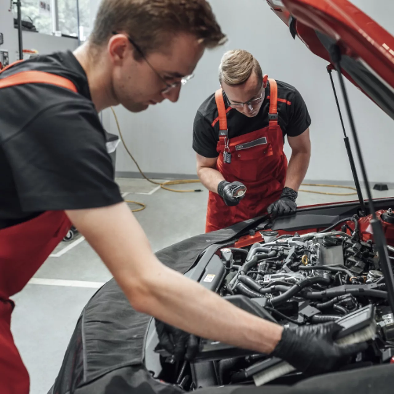 Przegląd wykonuje dwóch mechaników na dedykowanym, odpowiednio wyposażonym stanowisku. Ergonomia pracy i ustalona kolejność czynności obsługowych została szczegółowo zaplanowana, tak aby przegląd przebiegał sprawnie i efektywnie.