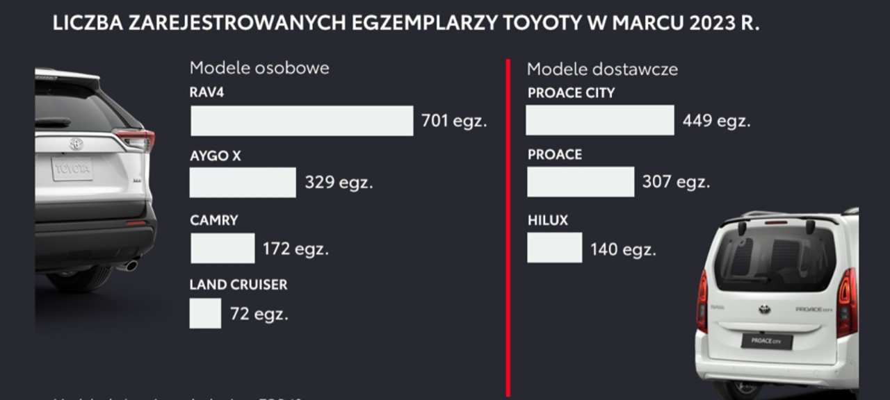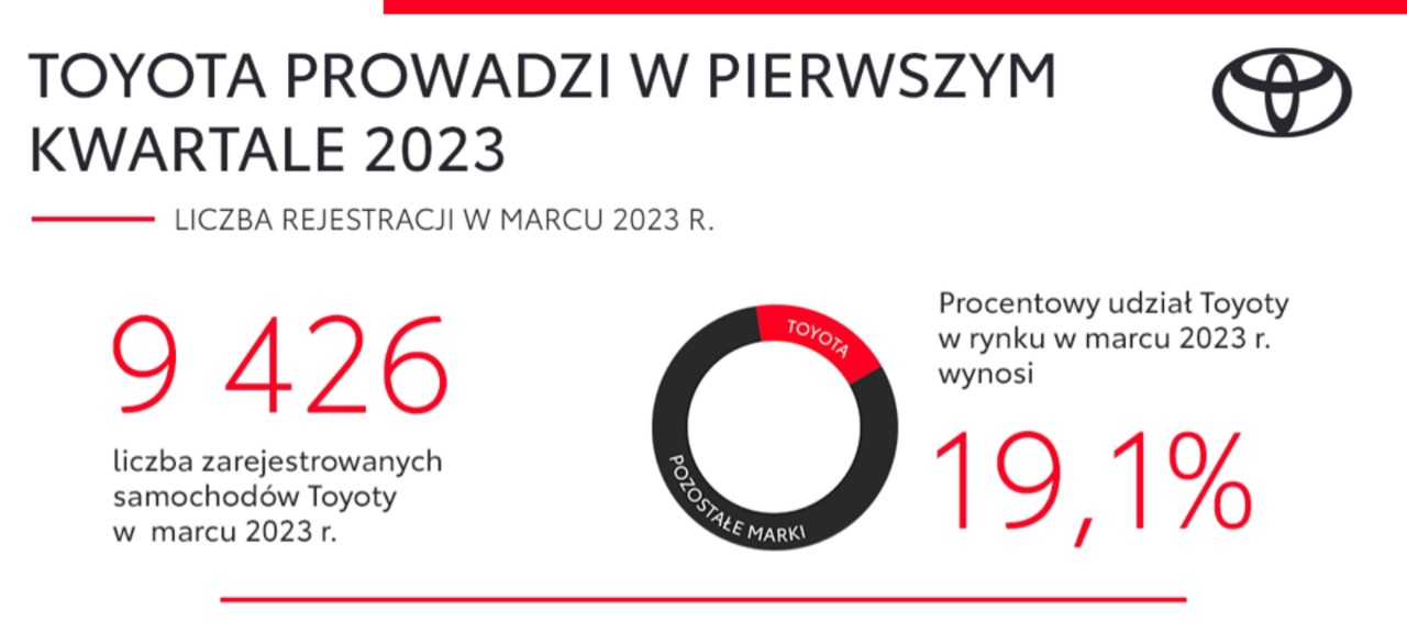 Pierwszy kwartał 2023 roku Toyota zakończyła jako lider polskiego rynku motoryzacyjnego. W tym czasie zarejestrowano 26 139 aut osobowych marki (ponad 2 razy więcej niż w przypadku marki zajmującej drugie miejsce w zestawieniu). Udział Toyoty w rynku samochodów osobowych wzrósł do 21,2% (+3,1 p.p. w porównaniu z analogicznym okresem 2022 roku).
