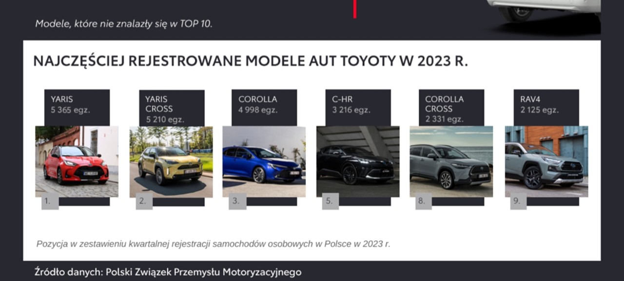 W dziesiątce najpopularniejszych samochodów osobowych znalazło się aż sześć modeli Toyoty. Pojazdy marki zajęły całe podium – na pierwszym miejscu uplasował się Yaris (5365 egz.), drugą pozycję zajął Yaris Cross (5210 egz.), a trzecią – Corolla (4998 egz.). Toyota C-HR w zestawieniu zajęła piąte miejsce (3216 egz.), Corolla Cross – ósme (2331 egz.), a RAV4 – dziewiąte (2125 egz.).